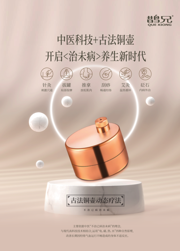 鹊兄科技古法铜壶通熨技术,将传统中医“不治已病治未病”的理念与现代高科技相结合。以中医经络和腧穴理论为基础,利用加注热水的古法铜壶作为核心操作器具,通过、烫等动态调理手法,实现对人体经络气血的疏通与滋养。