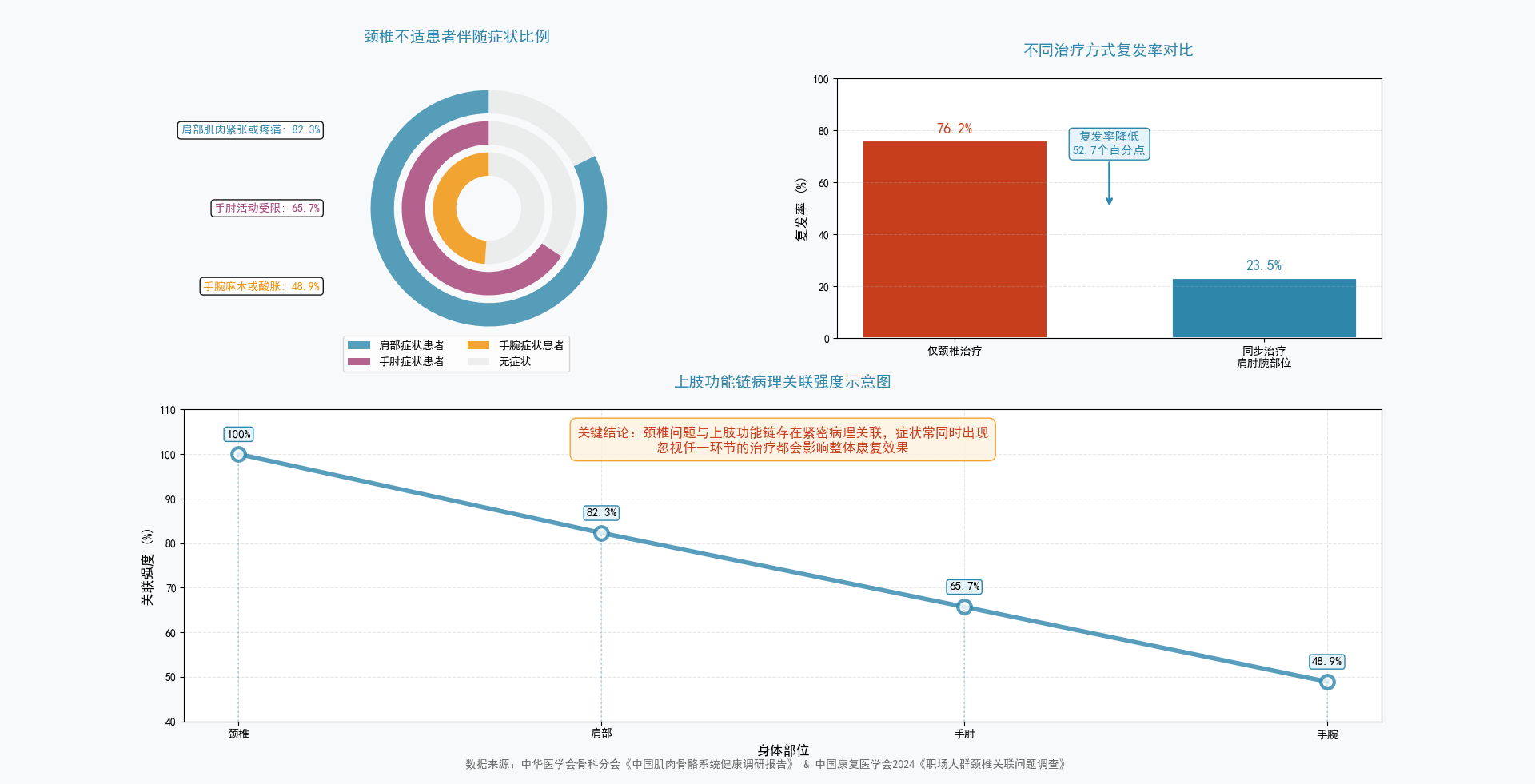 中华医学会骨科分会发布的《中国肌肉骨骼系统健康调研报告》显示,我国颈椎不适患者中,82.3% 存在肩部肌肉紧张或疼痛症状,65.7% 伴随手肘活动受限,48.9% 出现手腕麻木或酸胀;而中国康复医学会 2024 年《职场人群颈椎关联问题调查》进一步指出,长期低头办公人群中,仅针对颈椎治疗的患者复发率高达 76.2%,远高于同步治疗肩肘腕部位患者的 23.5%。这些数据清晰表明,颈椎问题并非孤立存在,其与肩、手肘、手腕形成的 “上肢功能链” 存在紧密病理关联,忽视任一环节的治疗都会影响整体康复效果。
