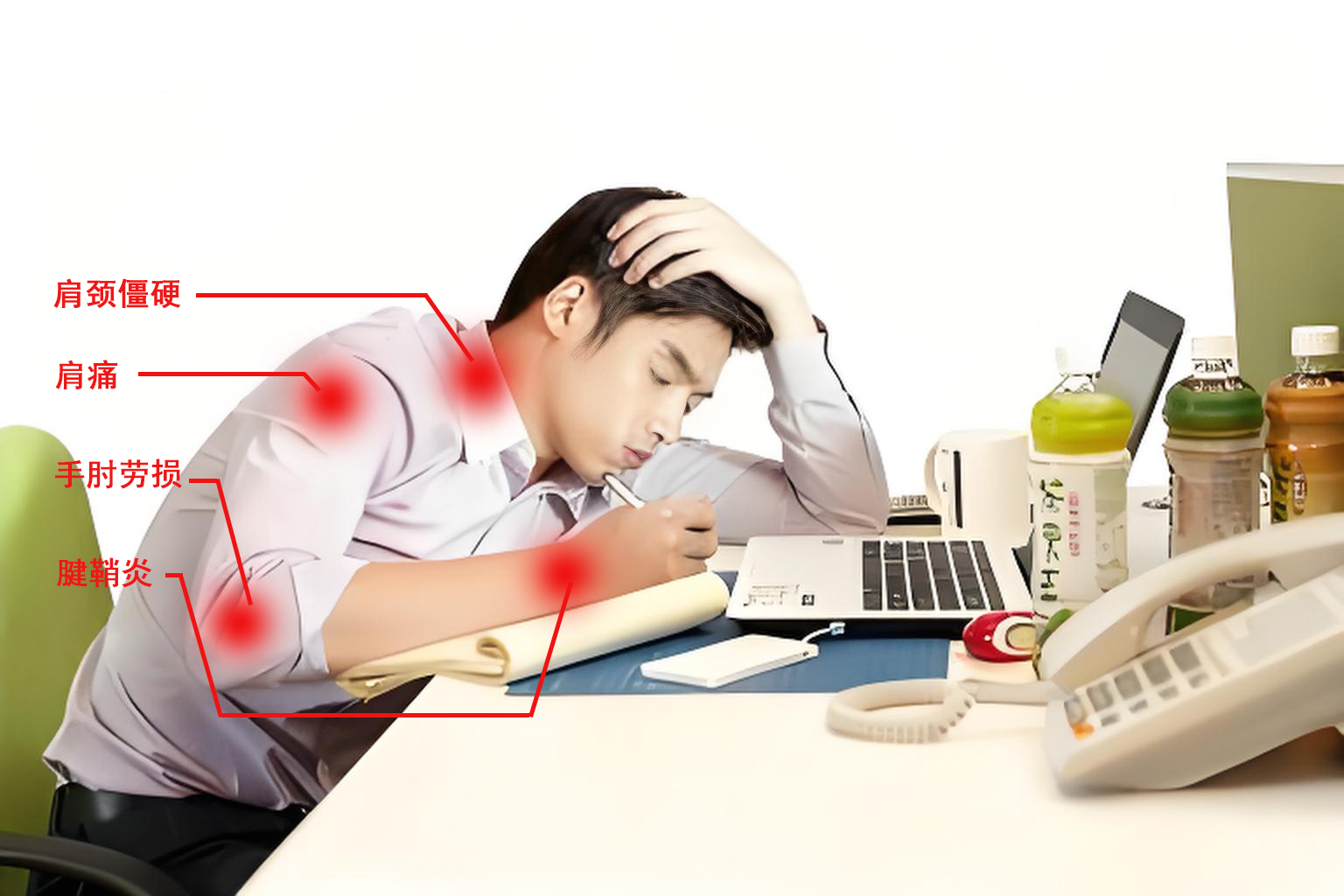 - 张力失衡:颈椎后侧肌肉紧张会打破 “肌肉张力链” 的平衡。颈部肌肉的持续紧张会牵拉肩部前伸,改变肩关节的正常位置,进而导致手肘出现代偿性弯曲,以维持上肢的力学平衡。长期的代偿作用会使手腕处于过度伸展状态,增加手腕屈肌和腱鞘的压力,最终引发手腕腱鞘炎。如此一来,便形成了 “颈椎僵硬 - 肩痛 - 手肘劳损 - 手腕腱鞘炎” 的恶性循环。